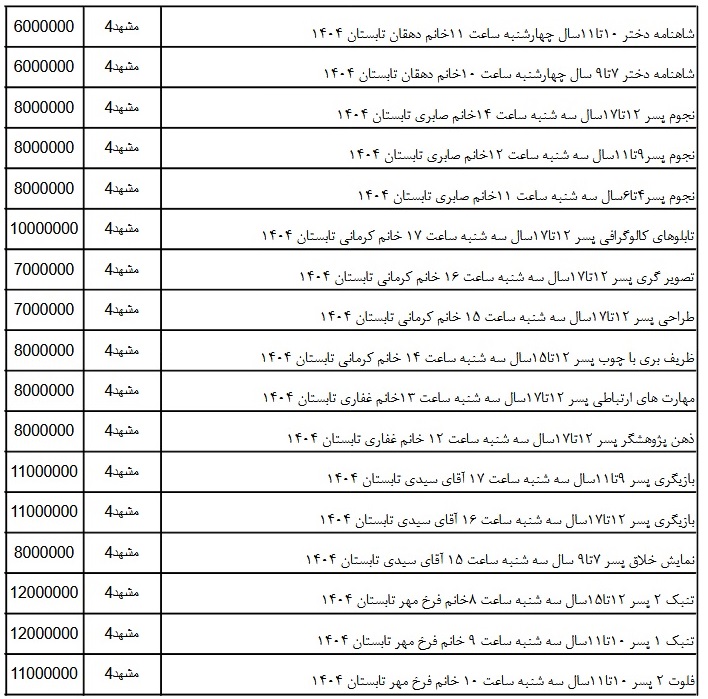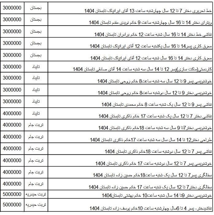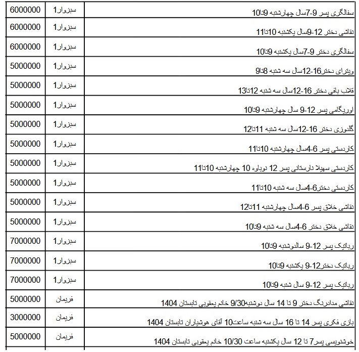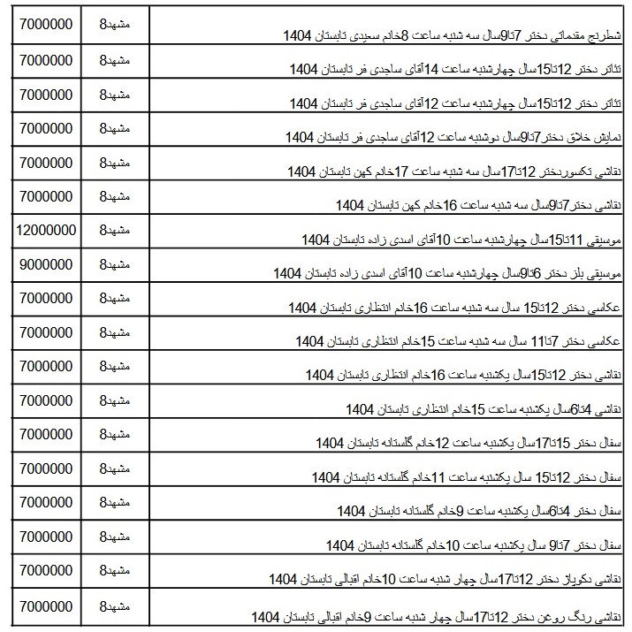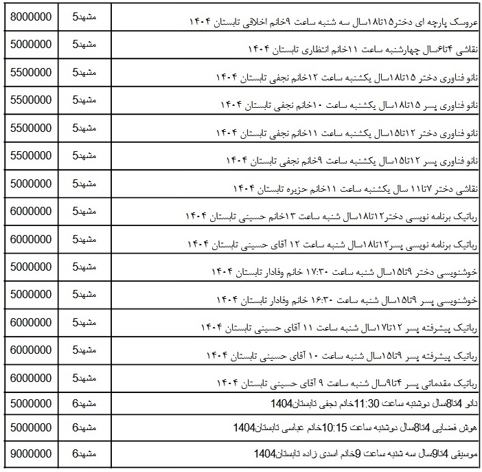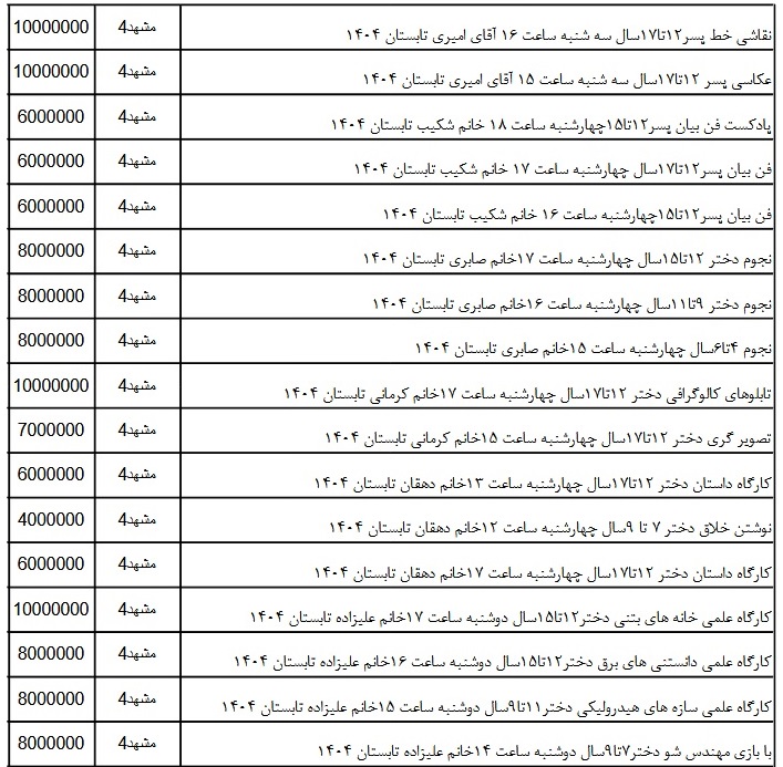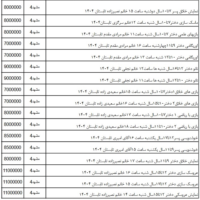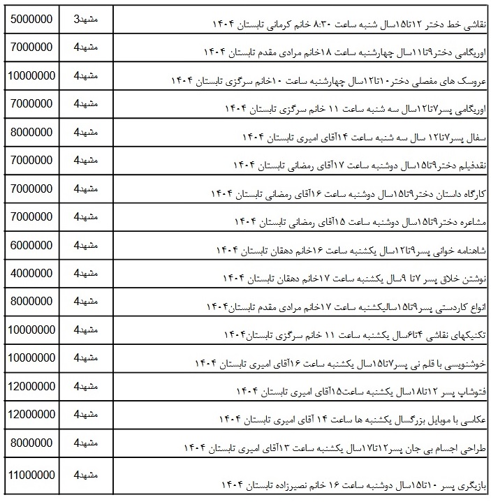 نقاشی، سفال، داستاننویسی، شعر، قصهگویی، نمایش خلاق، انیمیشن و صدها کارگاه دیگر